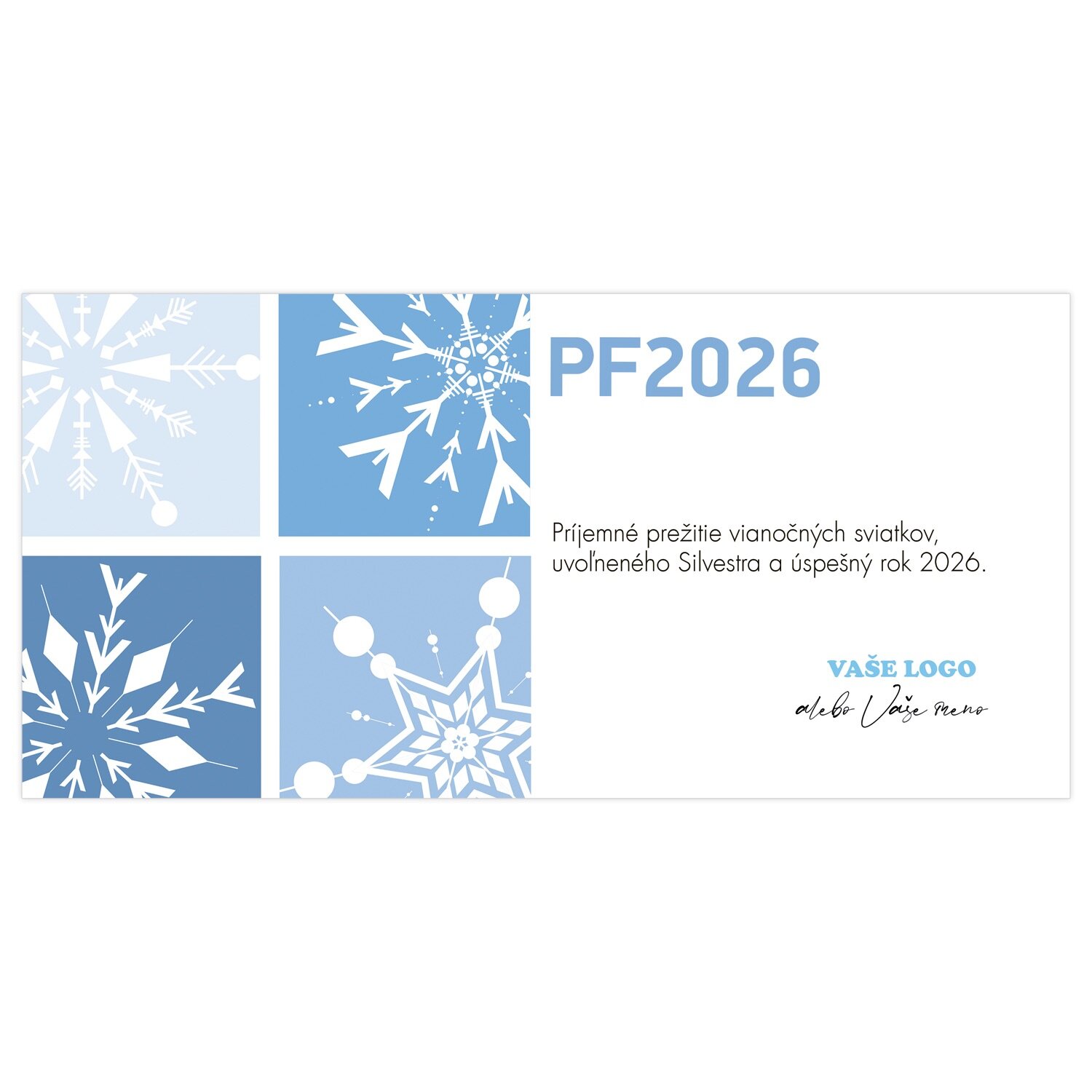 Štyri štvorce modrej farby, každý však iného odtieňa a prevedenie snehovej vločky. Táto novoročenka je zaujímavá, vkusná a nevtieravá zároveň. Skrátka najlepšia voľba na rozosielanie svojim obchodným partnerom a známym pred koncom tohto roka.