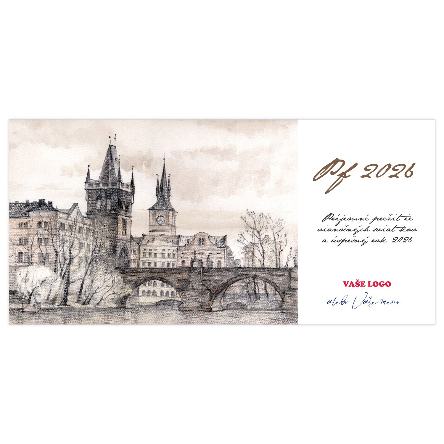 Novoročenka s kresbou Karlovho mosta pôsobí skoro ako by ste ju vytvorili vlastnou rukou, čo len posilní osobné čaro vášho priania.