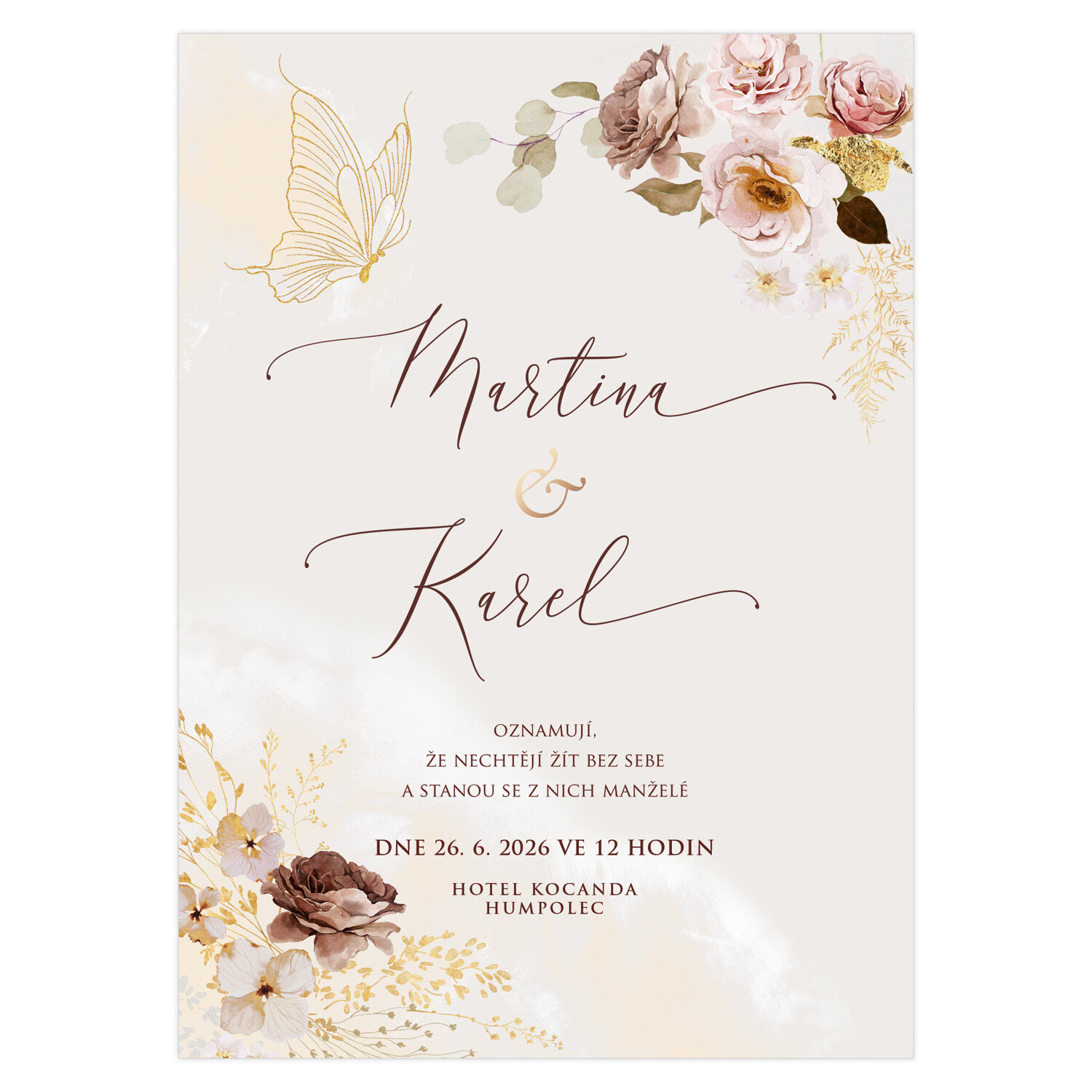 Jednoduchým štýlom a eleganciou zapôsobí kvetinové svadobné oznámenie so zlatým motýľom.
